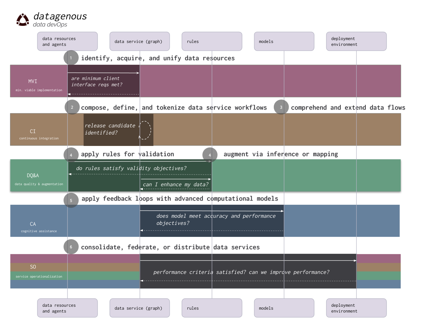 datagenous provides capability for continuous integration (CI) of data services and flows utilizing a practice we refer to as retrospective late binding (RLB). This practice is powered by our schemaless, RDF versioned data access layer that decouples data flows from underlying control flows. This decoupling enables development teams and SMEs to logically unify semantic structures without worrying about breaking brittle schema and underlying data structures.