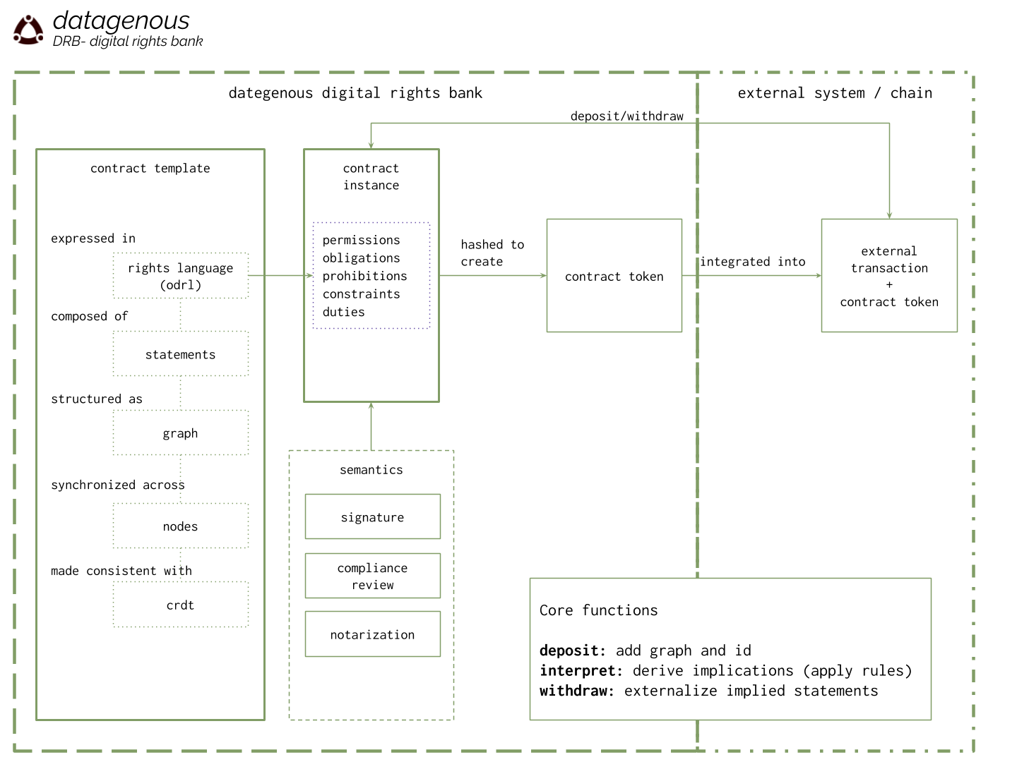 datagenous can serve as a digital rights bank (DRB): a digital asset management (e-rights)/tokenization and extensible open contracting capability that provides a way to express and manage digital assets in a distributed information economy.