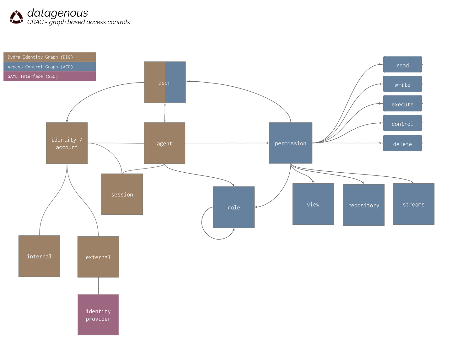 datageno.us stores and manages identity, role, and authorization/permissions information as semantic graphs which supports a programmatic interface to specify agents and their access rights to system resources. The model supports controls such as those defined in role based access control (RBAC) systems with one key difference, the ability to use programmatic interfaces to specify access controls as opposed to total enumeration.